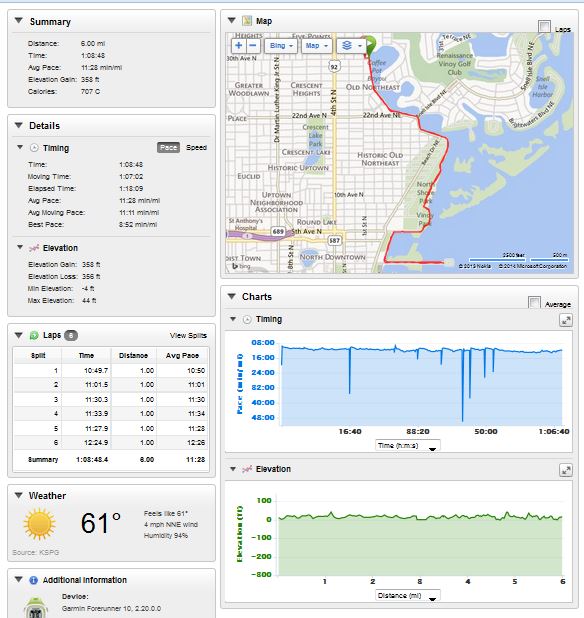Upon powering it up I press the run button allowing a few moments to gather my location. As I transition into my run the watch monitors my progress and notifies me at every mile with the pace time for that mile. Upon completion of my run the data stored contains the number of miles, overall time, average pace time as well as the total calories burned. It even informs me of my personal records such as fastest mile and fastest 5k.