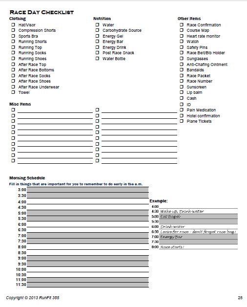 I’ve already begun to pull essentials I’ll need, like my visor, race belt, fuel (I plan to use my trusty SportBeans and my recent love for PowerGel), inhaler, compression sleeves, etc. setting them off to the side so I don’t forget them in the process of packing. I’m grateful my training plan from RunFit365 included a Race Day Checklist to ensure I don’t forget even the most basic essentials.