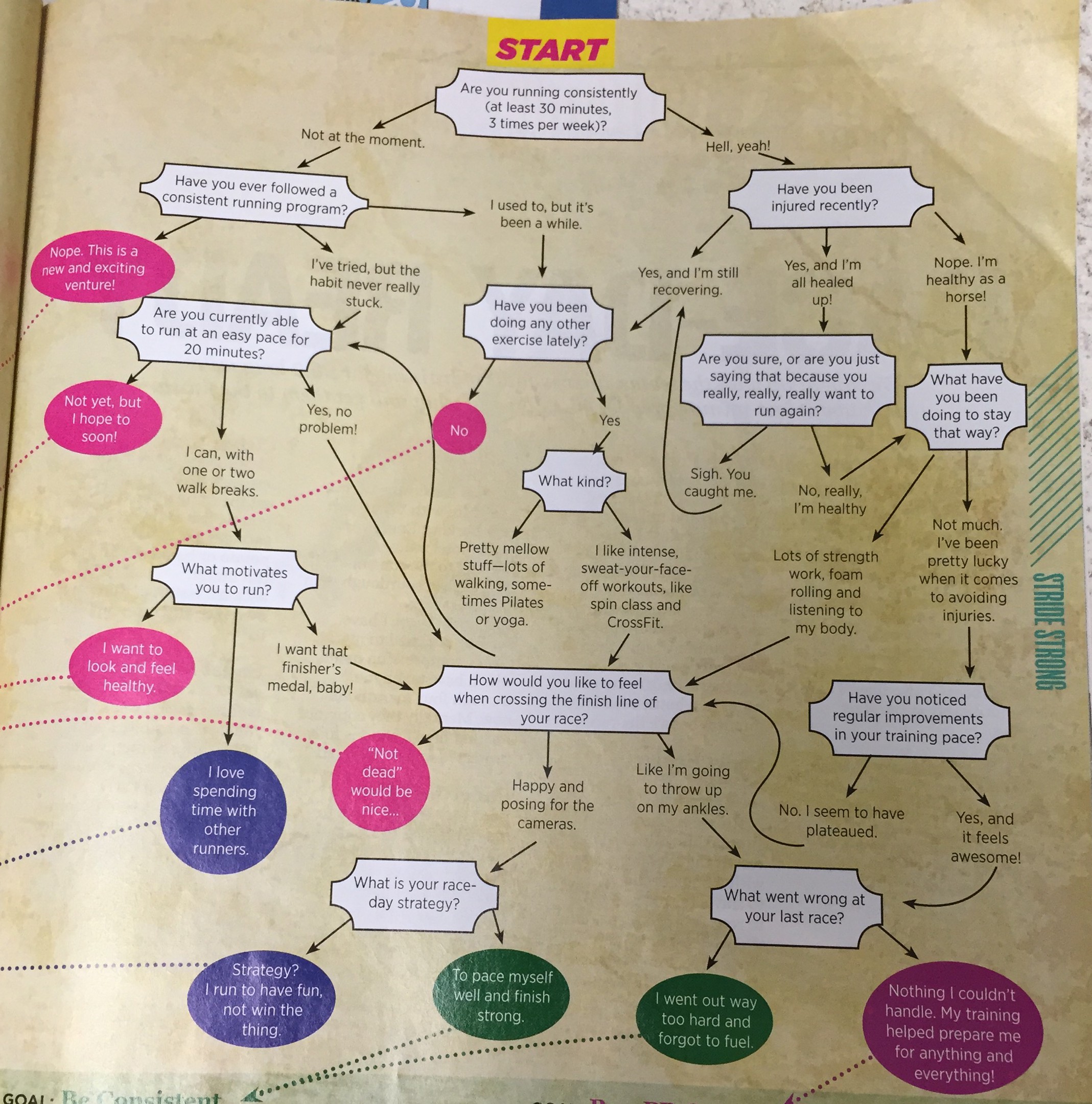 Recently, I’ve implemented some new things to my training and tested out a new re-fuel routine on my run that I believe played a factor. In the latest issue of the Women’s Running magazine I read an article titled “Follow Your Path” about what you should aim for in 2015. The article included a chart with questions for you to answer to lead you towards your projected goal.