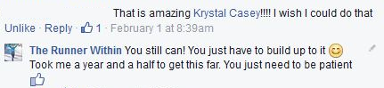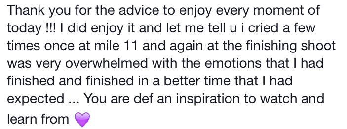 That same day another friend, we’ll call her K, had completed her first half marathon. The night before I left K an encouraging message to go out and enjoy each mile focusing on finish strong because you only ever run your first half marathon once. Later that evening she posted this on my Facebook page.