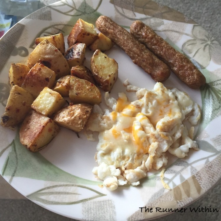 The next morning, for breakfast, I scrambled up some egg whites with cheese, chicken sausage links and left over roasted potatoes.