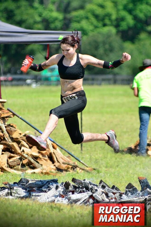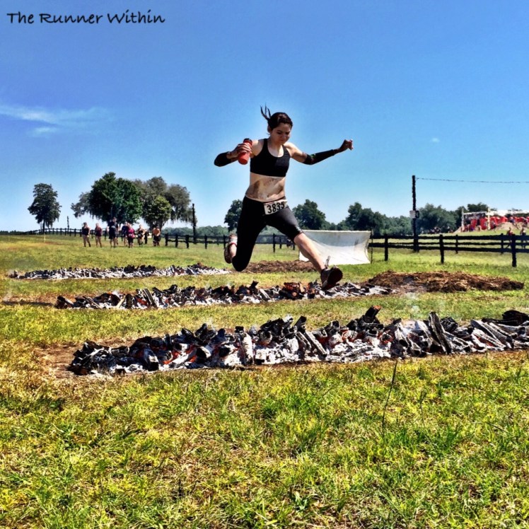 I tried not to stress too much over the time and just continued on with the course. We quickly approached Waterworks and Leap of Faith, both of these obstacles were very refreshing as they involved jumping into water. After Leap of Faith came the dread The Ringer, I only say dreaded because I knew this was solely an upper body obstacle. The concept behind the Ringer was to swing like a monkey from each “ring.” I was never good at the monkey bars in elementary school, so I already knew I would come crashing into the water pit within five seconds…what I had not anticipated was to come crashing into the water and land with ALL my body weight on my left foot. I could immediately feel pain shoot out in my ankle, to the point I thought I had sprained, fracture, maybe even broken my ankle. I was able to wade my way out of the water pit and out of it. Thankfully, I was able to walk on it, but it was definitely sore and sore for several days after that I had to keep it wrapped and apply minimal pressure on it. It didn’t help that I continued on to the next obstacle which was Pyromaniac, a.k.a jumping over three fire pits…at least I got some good action shots…