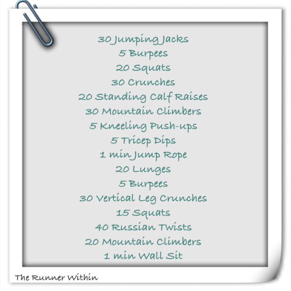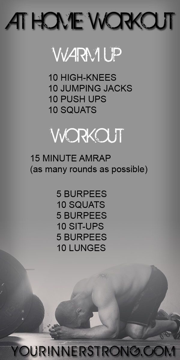 Monday: Full body cardio and strength training, 3 rounds in 15 mins.
