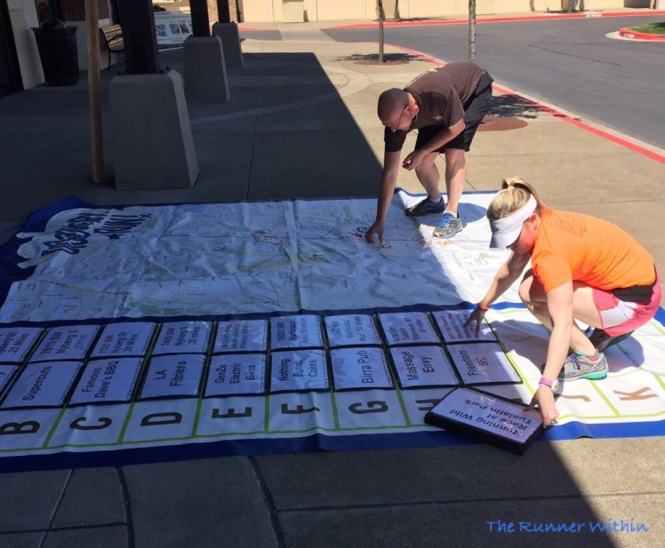 To help runners navigate to their checkpoints a map is posted, but not revealed till the start of the run. If you register online before hand, a map will also be emailed to you. Another plus is if you like the event on Facebook a special checkpoint will be revealed to those for additional tickets! The map lists the locations of the checkpoints, the address and the distance of the checkpoint from the start/finish. (completed map shown further down)