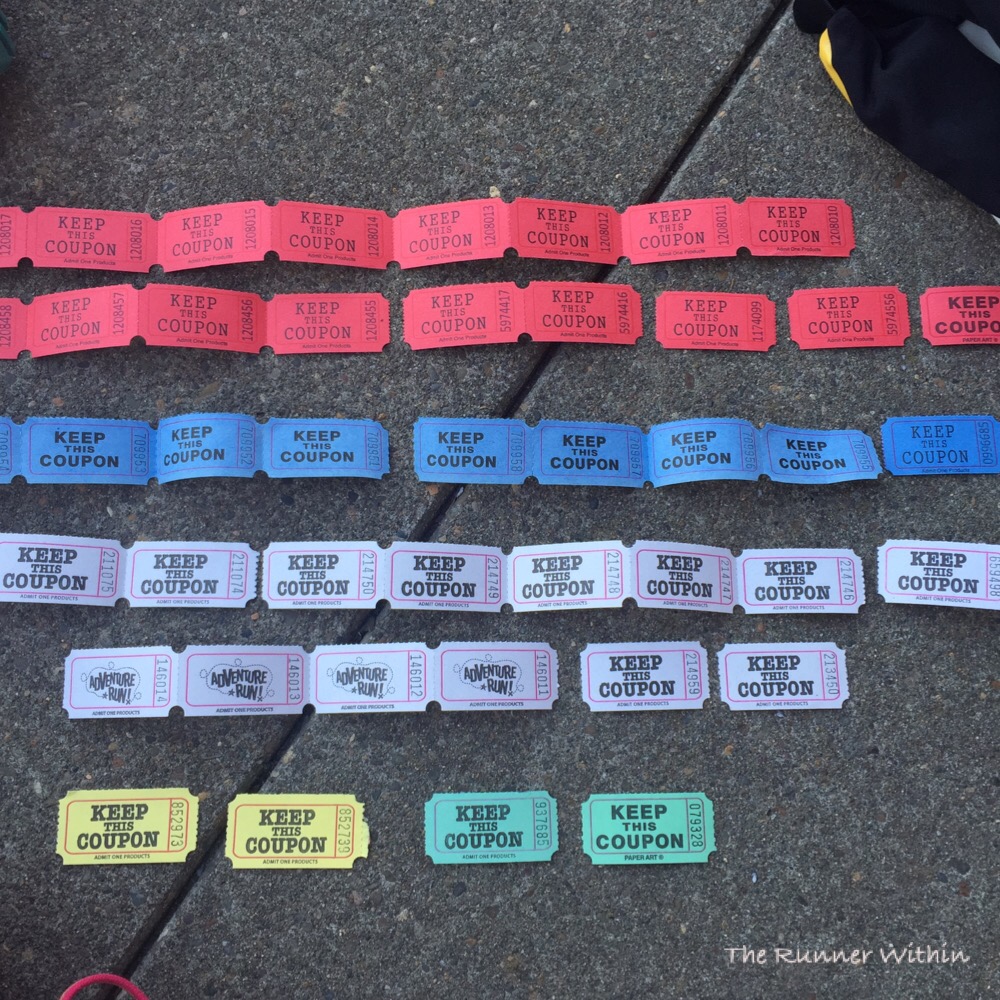 The concept behind the Discovery Run is a 5K course is setup around 12 checkpoints that you run to to collect tickets. The volunteers at the checkpoints have the option to assign you a task to do in order to redeem your tickets. If you are wearing one of the “Discovery Run” shirts you get double the tickets, shirts are available for purchase. You only have an hour to hit up as ticket stops as you can, some may be at a business, others may be free standing like at a park. Once the run is complete you go through your tickets and tear off the stubs keeping the coupon part and turning in the “Ticket” part, the one half of the tickets are put in a bin and a raffle is drawn for prizes. Prizes can range from a free pair of shoes to the gift card at the running store, if one of the participating business was a restaurant they may donate a gift card or a free appetizer voucher to be give away, etc. The drawing lasts roughly a half hour with various winners.