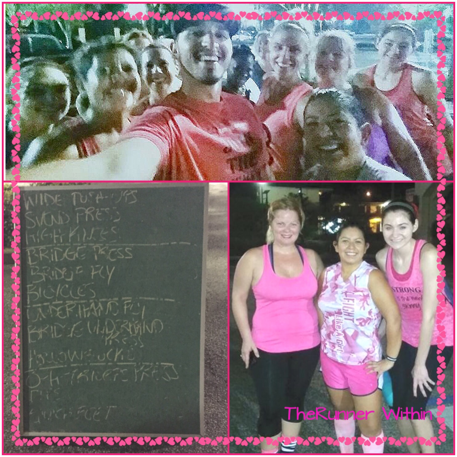 Wednesday: Continuing with HIIT week, but today we focused more with weights and other forms of cardio. As you can see in the picture below we had a special “Pinktober” themed workout to support breast cancer awareness.