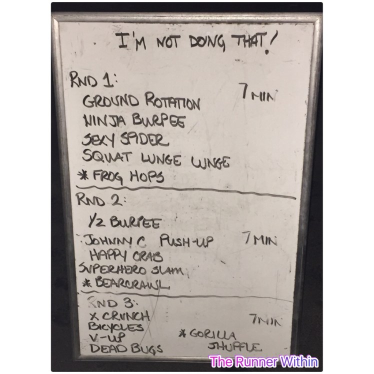 Tuesday: 2 mile run before CG. Today’s workout was called “I’m Not Doing That!” We were broken off into groups of 4, each person was assigned a number and based on that number you skipped the exercise in rotation for the travel. So for example, if you were assigned 2, you skipped the ninja burpees in round 1 and did frog hops instead and then come back and complete exercises 1, 3-4.