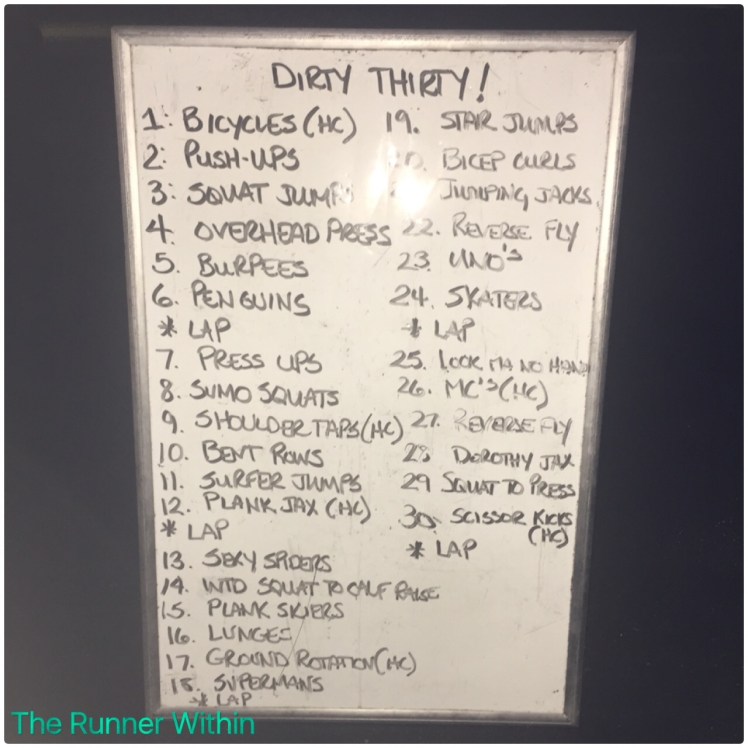 Wednesday: 2 mile run before camp, this mornings workout was no joke! Endurance week at it’s best with Dirty Thirty! Thirty minutes, 30 exercises, 30 reps for non weighted work, 15 if weighted (you split the 30 with a partner). I made it up until the Uno’s. This is a good benchmark workout and I’ll be interested to see how far I make it next time we do this one.