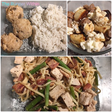 I’ve stocked up on on-course fuel and have everything I need leading up to race weekend, including electrolyte water and meal preparation with balanced ratios of carbs and protein. Some of my meals this week include a breakfast scramble with egg whites, chicken sausage and Hannah sweet potatoes. Lunch is a Bacon Asparagus Pasta with a white wine reduction sauce and I added in some chicken for added protein. Last but not least for dinner I made Lemongrass Chicken Meatballs with Thai Coconut Basmati Rice.