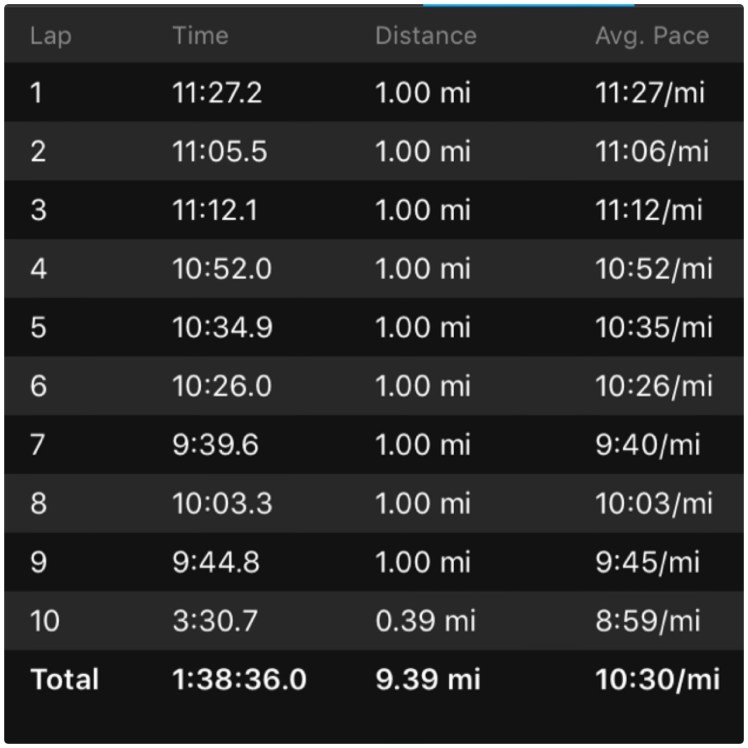Shortly after I took my last walk break and then ramped myself up to a comfortable pace to get me the last .3 miles to the finish crossing at 1:38:36.